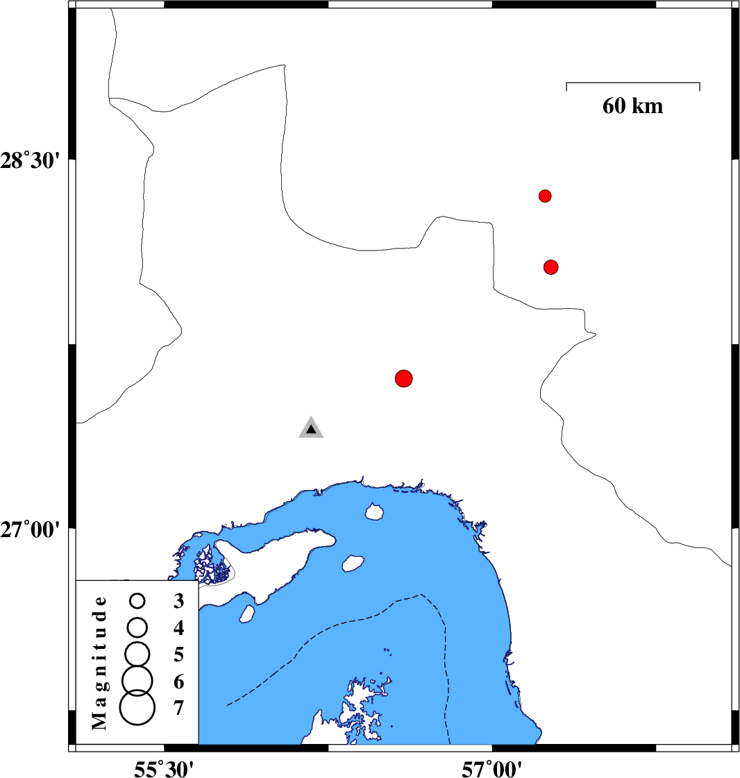 | 2017/04/09 | 17:41:24.2 | 22:11:24.2 | 28.064 | 57.269 | 18 | ML2.9 | Kerman Province, 44 km North-West of Kahnuj |