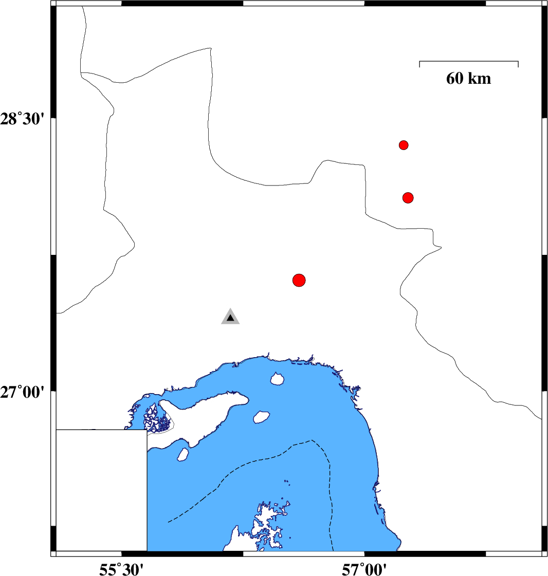 2017/04/09 | 17:41:24.2 | 22:11:24.2 | 28.064 | 57.269 | 18 | ML2.9 | Kerman Province, 44 km North-West of Kahnuj |