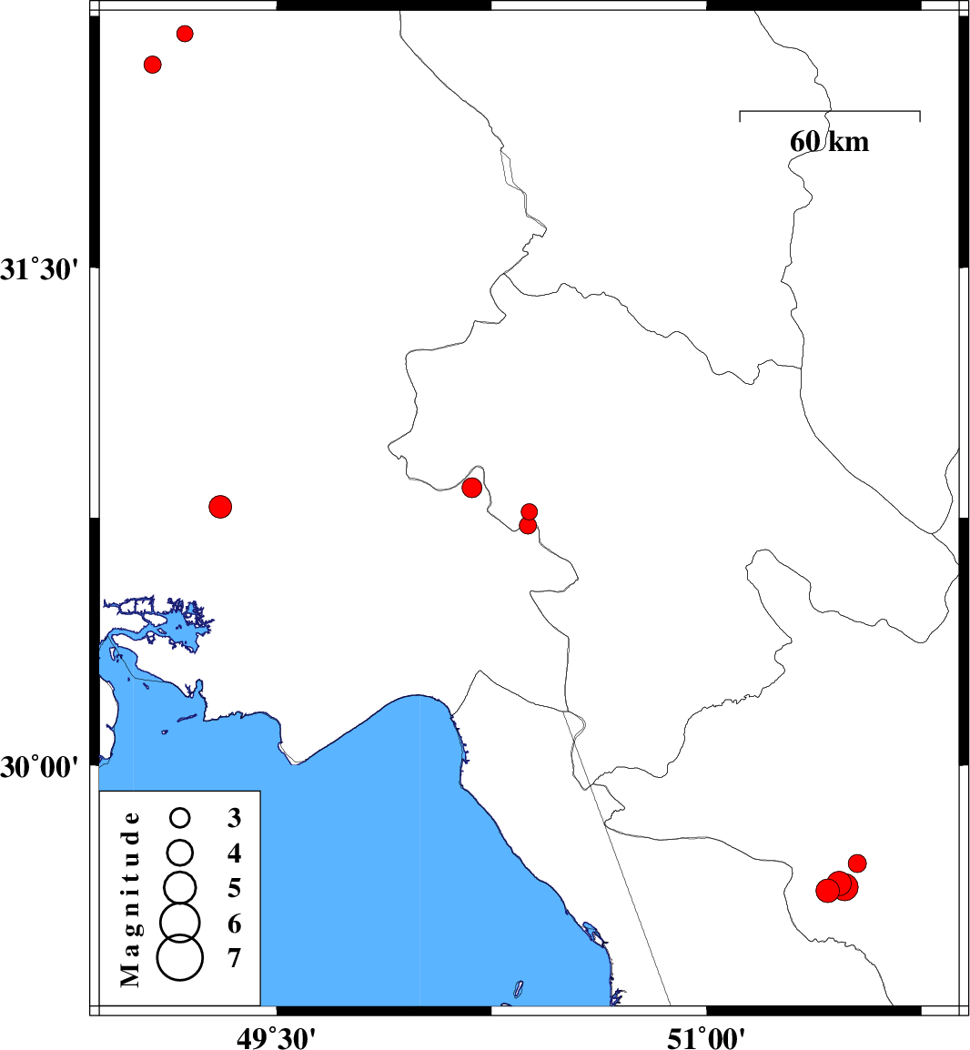 | 2017/03/24 | 11:23:12.1 | 15:53:12.1 | 30.782 | 49.303 | 15 | ML3.5 | Khoozestan Province, 27 km North-East of Bandar-e mahshahr | ||