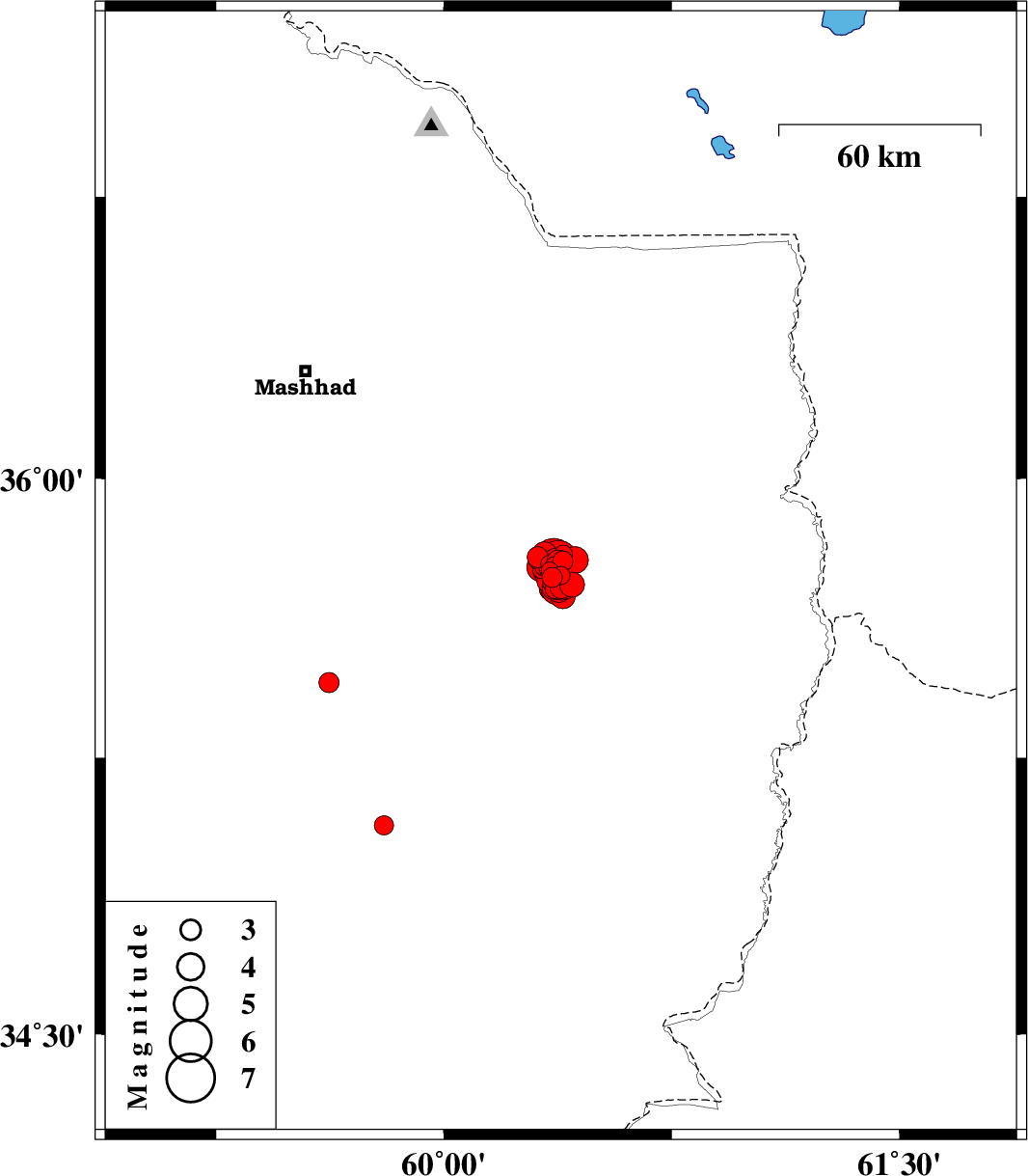 | 2017/04/08 | 04:02:43.3 | 08:32:43.3 | 35.71 | 60.391 | 15 | ML3 | Khorasan(center) Province, 49 km -East of Fariman | ||