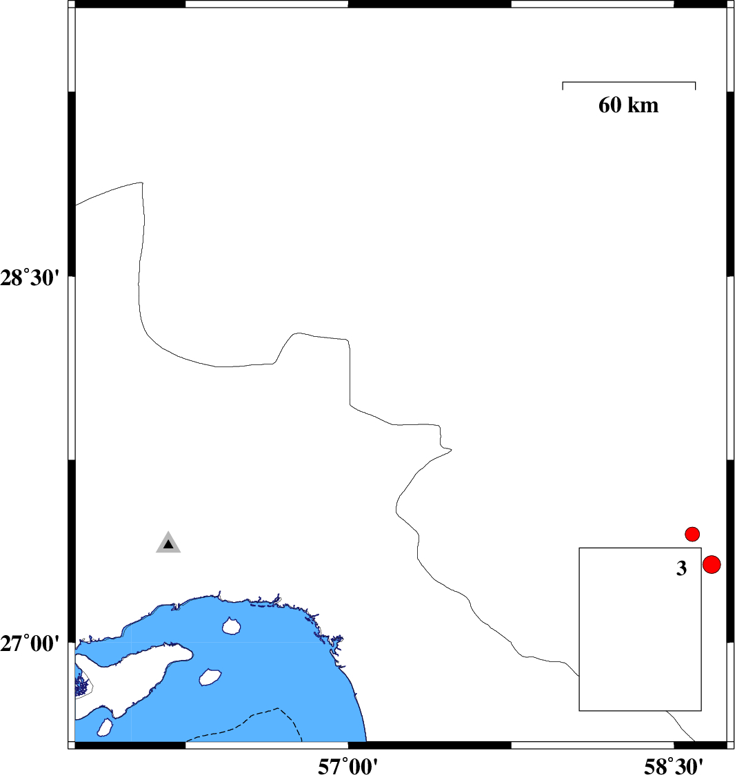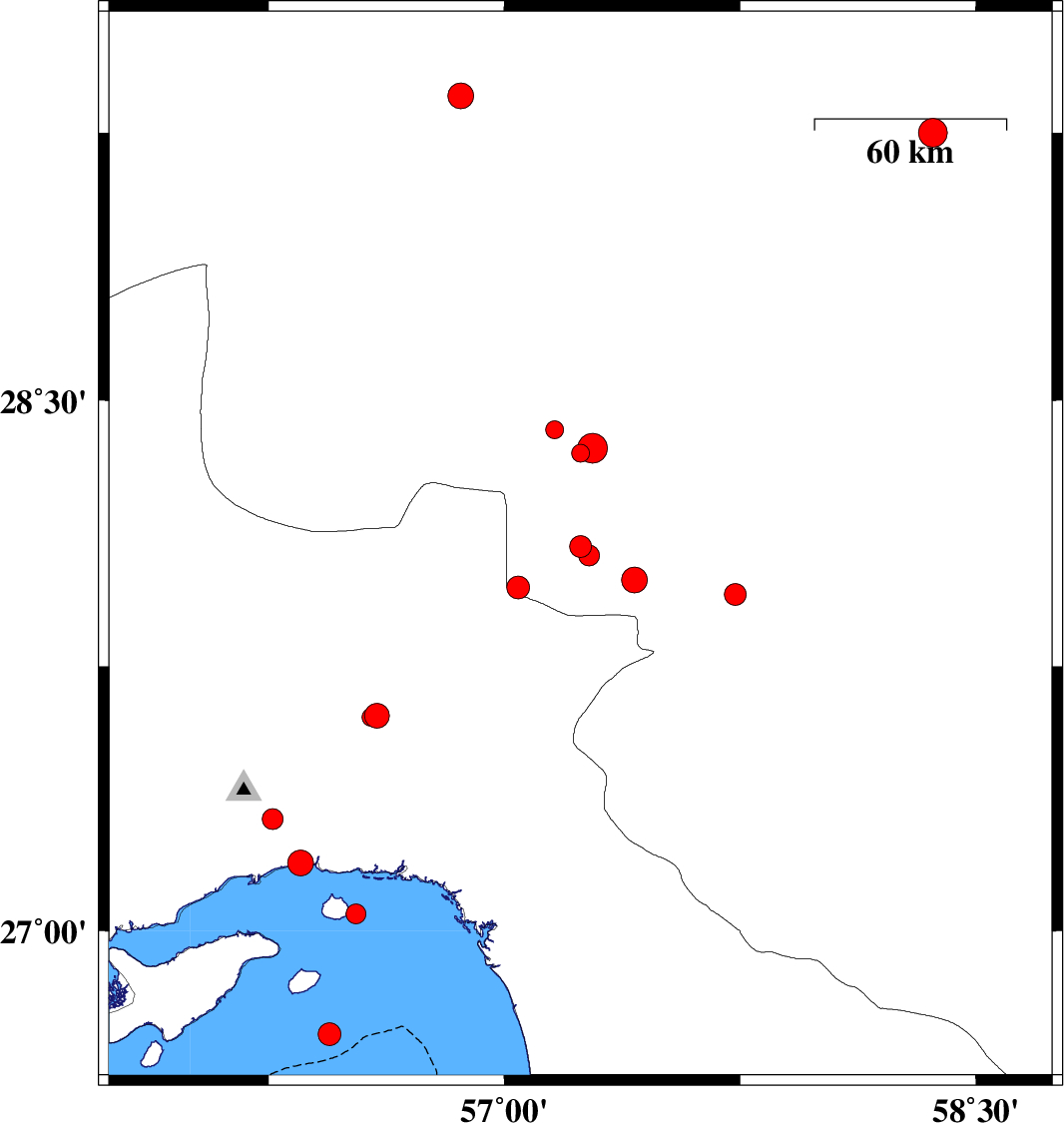 | 2017/03/19 | 16:09:47.5 | 19:39:47.5 | 27.954 | 57.735 | 16 | ML3.1 | Kerman Province, 4 km of Kahnuj |