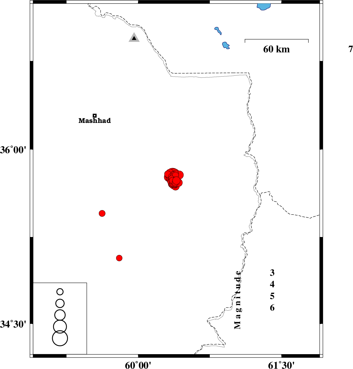 | 2017/04/08 | 04:02:43.3 | 08:32:43.3 | 35.71 | 60.391 | 15 | ML3 | Khorasan(center) Province, 49 km -East of Fariman | ||