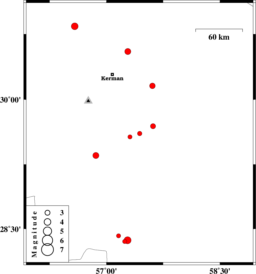 | 2017/04/06 | 12:09:42.8 | 16:39:42.8 | 30.157 | 57.609 | 14 | ML3.4 | Kerman Province, 53 km South-East of Kerman | ||