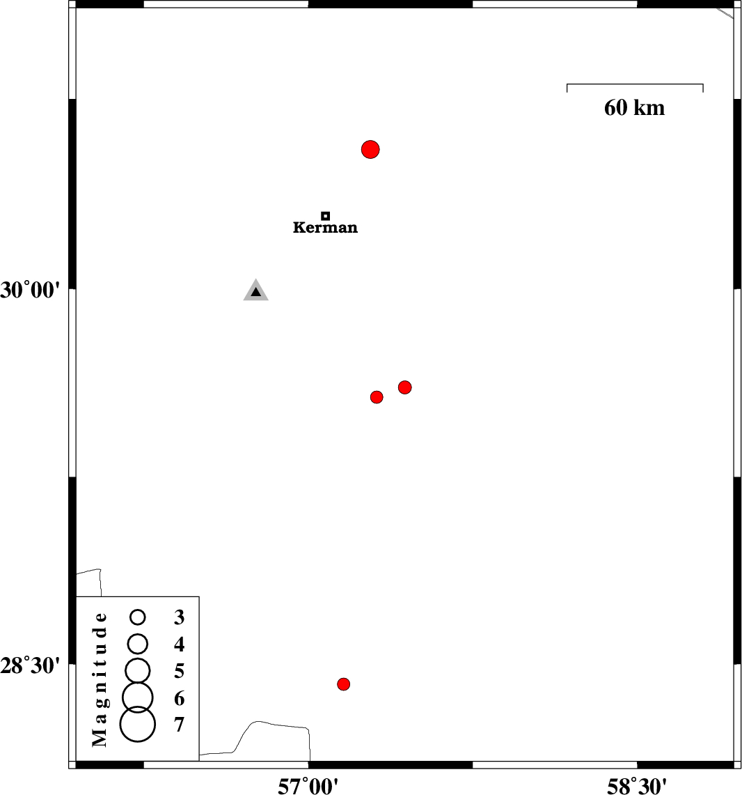 2017/04/20 | 05:40:16.7 | 10:10:16.7 | 30.55 | 57.283 | 15 | ML:3.6 | Kerman Province, 35 km North-East of Kerman | ||