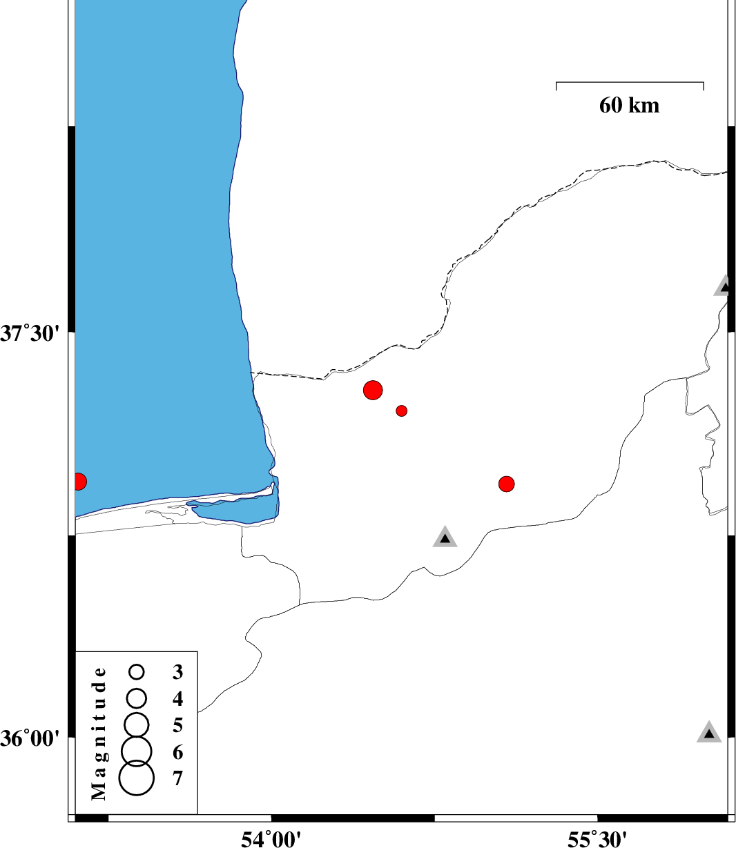 | 2017/04/24 | 11:09:12.2 | 15:39:12.2 | 36.95 | 53.111 | 14 | ML3.5 | Caspian Sea, 44 km North of Sari | ||
