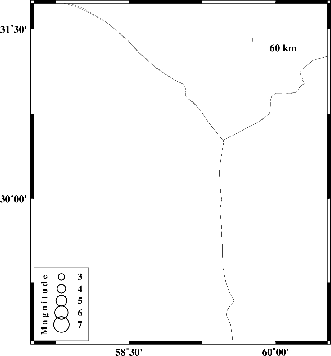 | 2017/04/25 | 23:52:20.9 | 04:22:20.9 | 30.223 | 59.028 | 14 | ML2.5 | Kerman Province, 140 km North-East of Bam |