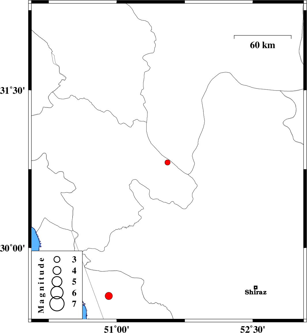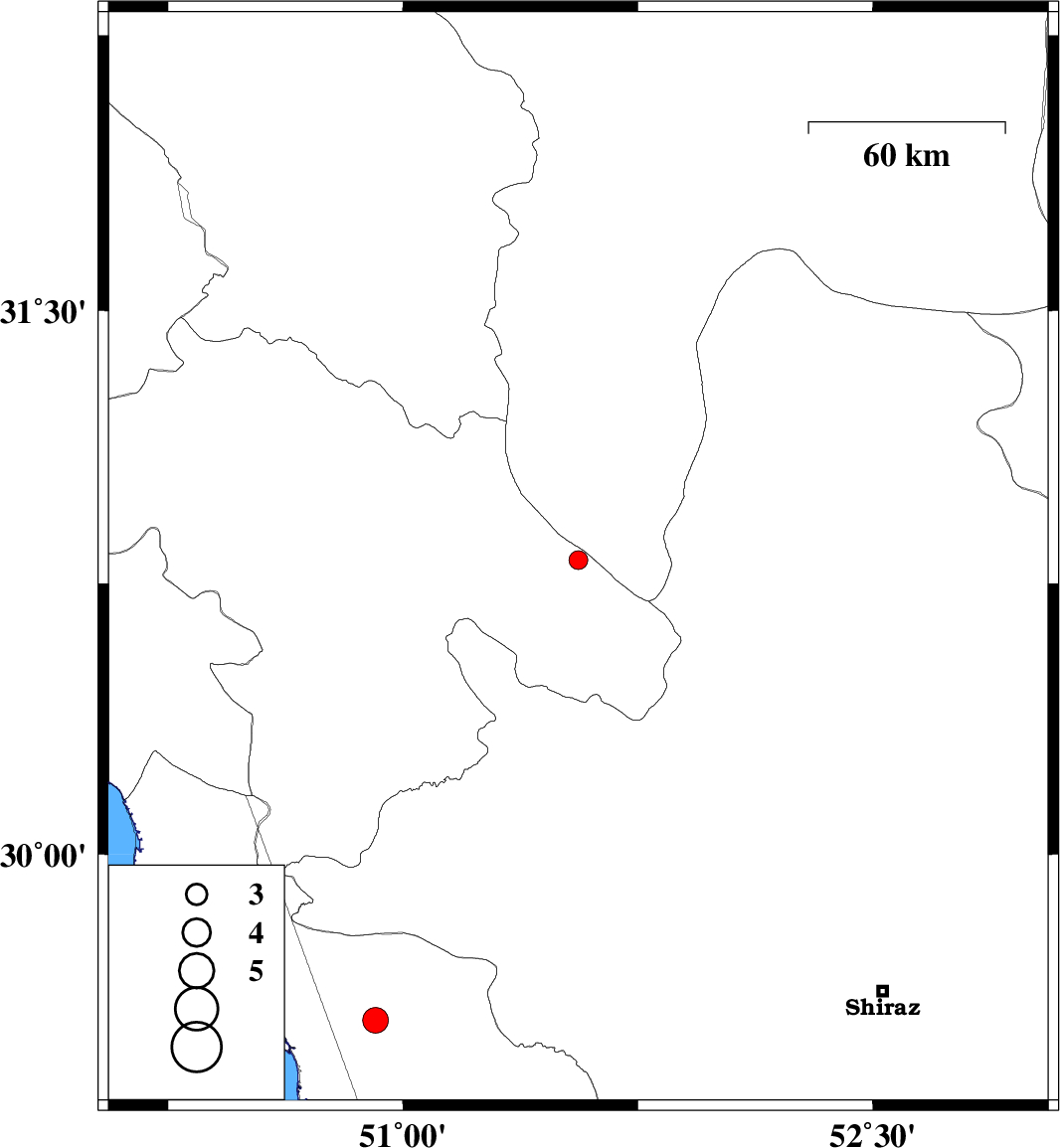 | 2017/04/26 | 10:28:27.3 | 14:58:27.3 | 29.538 | 50.912 | 18 | ML3.6 | Bushehr Province, 39 km -East of Bandar-e genaveh |