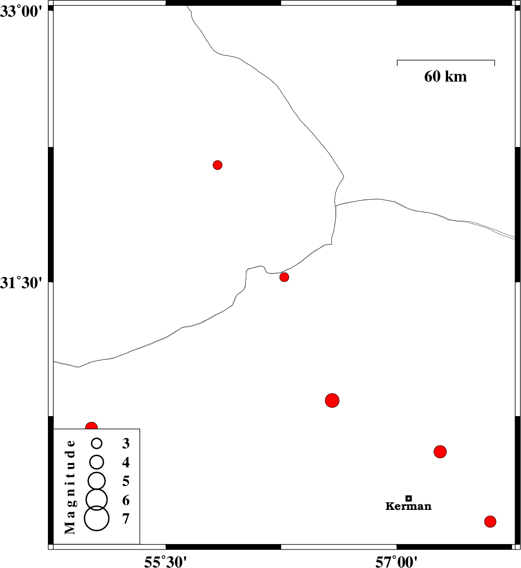 | 2017/04/06 | 12:09:42.8 | 16:39:42.8 | 30.157 | 57.609 | 14 | ML3.4 | Kerman Province, 53 km South-East of Kerman |