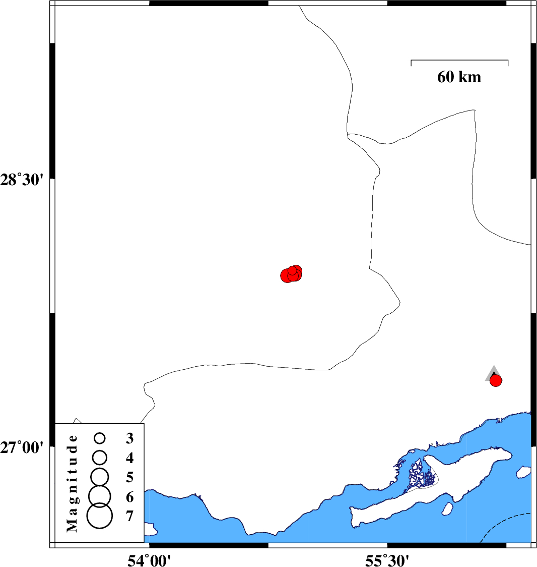 | 2017/04/22 | 07:40:23.7 | 12:10:23.7 | 27.984 | 54.925 | 14 | ML3.4 | Fars Province, 67 km North-East of Lar |
