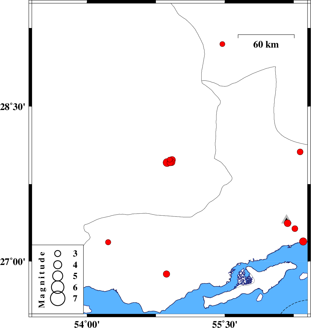| 2017/04/15 | 04:37:21.5 | 09:07:21.5 | 26.877 | 54.866 | 17 | ML3.3 | Hormozgan Province, 39 km North of Bandar-e lengeh | ||