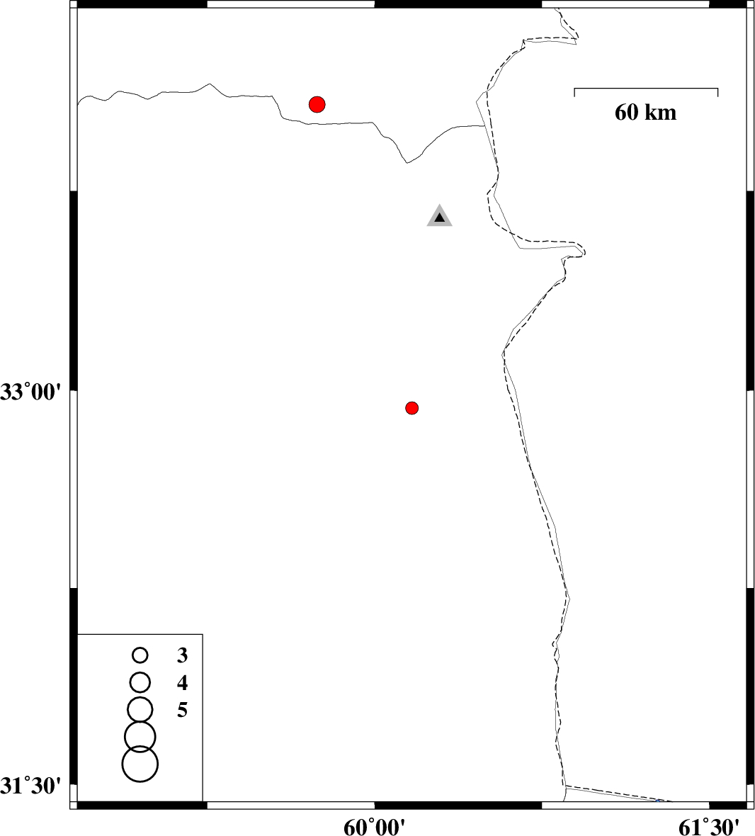2017/04/29 | 10:13:29.6 | 14:43:29.6 | 32.933 | 60.167 | 14 | ML2.5 | Khorasan(south) Province, 49 km North-East of Sarbisheh |