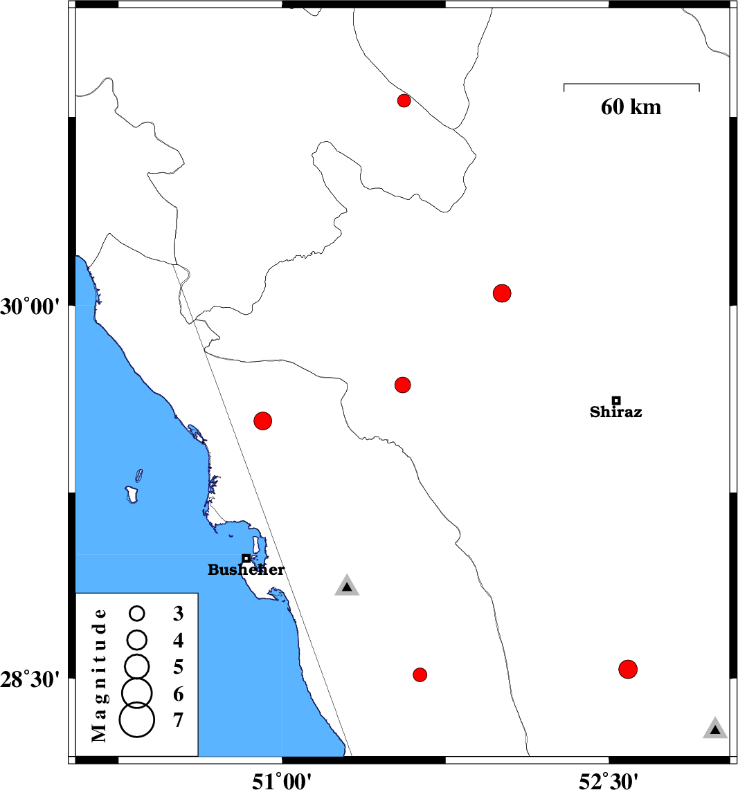 | 2017/04/26 | 10:28:27.3 | 14:58:27.3 | 29.538 | 50.912 | 18 | ML3.6 | Bushehr Province, 39 km -East of Bandar-e genaveh |