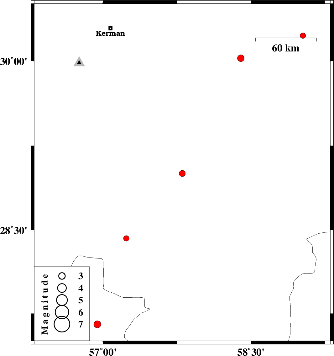 | 2017/04/25 | 12:40:01.8 | 17:10:01.8 | 28.424 | 57.239 | 14 | ML2.6 | Kerman Province, 56 km South-West of Jiroft |