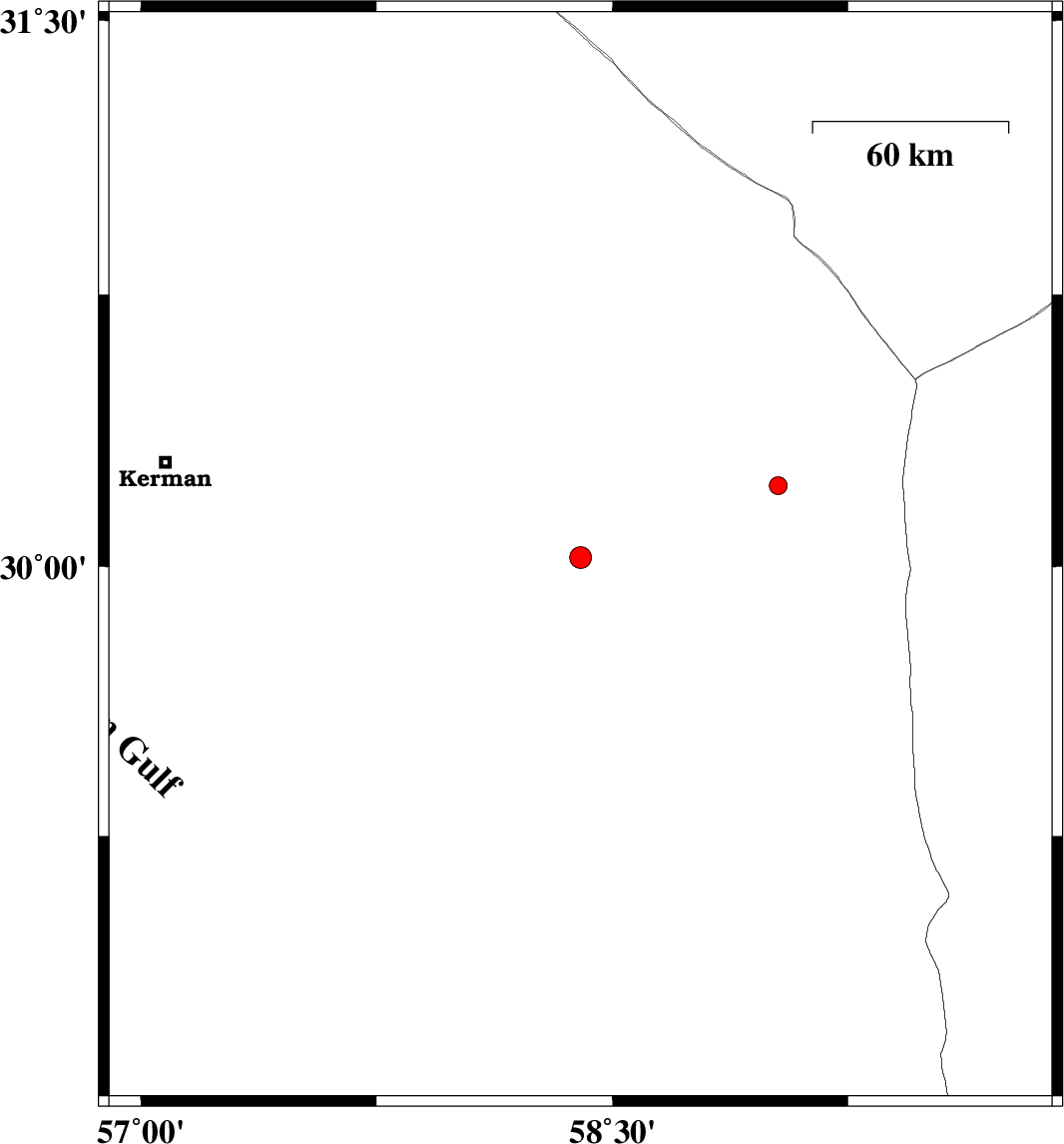2017/05/01 | 09:45:08.8 | 14:15:08.8 | 30.024 | 58.399 | 15 | ML:3.1 | Kerman Province, 102 km North of Bam | ||