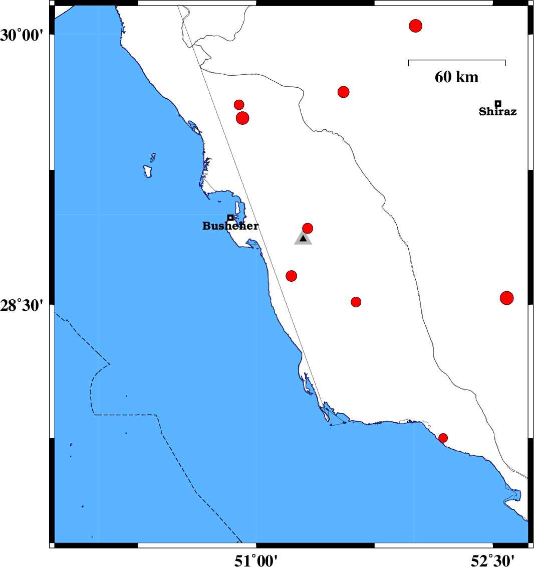 | 2017/05/09 | 03:00:27.3 | 07:30:27.3 | 28.659 | 51.222 | 17 | ML3.1 | Bushehr Province, 15 km -West of Khormog | ||
