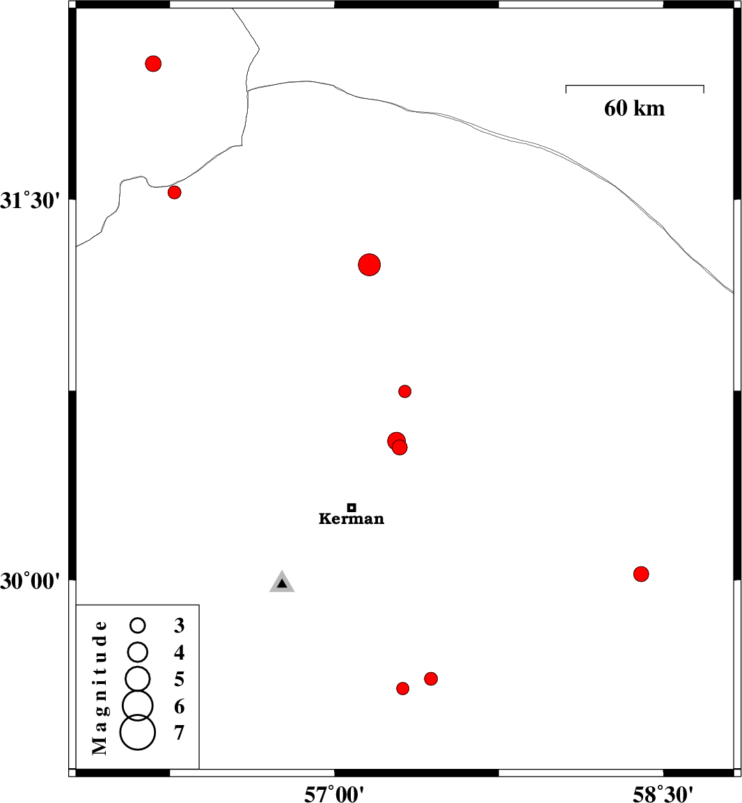 | 2017/04/20 | 05:40:16.7 | 10:10:16.7 | 30.55 | 57.283 | 15 | ML3.6 | Kerman Province, 35 km North-East of Kerman |