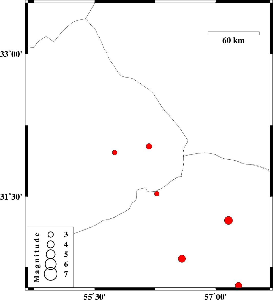 | 2017/04/20 | 05:40:16.7 | 10:10:16.7 | 30.55 | 57.283 | 15 | ML3.6 | Kerman Province, 35 km North-East of Kerman | ||