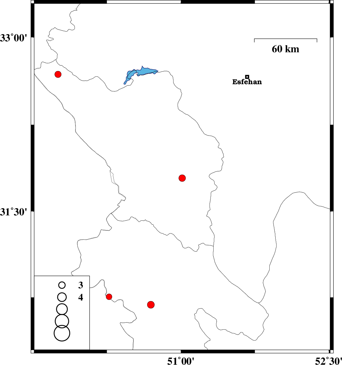 2017/05/13 | 23:54:57.7 | 04:24:57.7 | 30.685 | 50.695 | 46 | ML3.3 | Kohkiluieh va boyerahmad Province, 17 km South-East of Dehdasht | ||