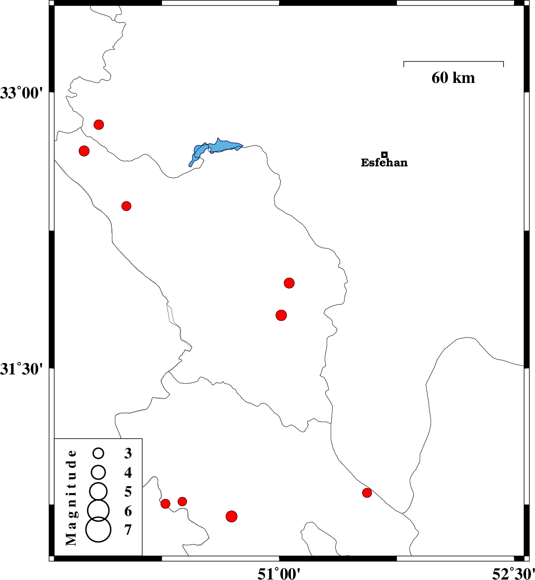 | 2017/04/30 | 01:54:20.5 | 06:24:20.5 | 32.825 | 49.847 | 15 | ML2.8 | Esfahan Province, 28 km South-West of Fereydunshahr | ||