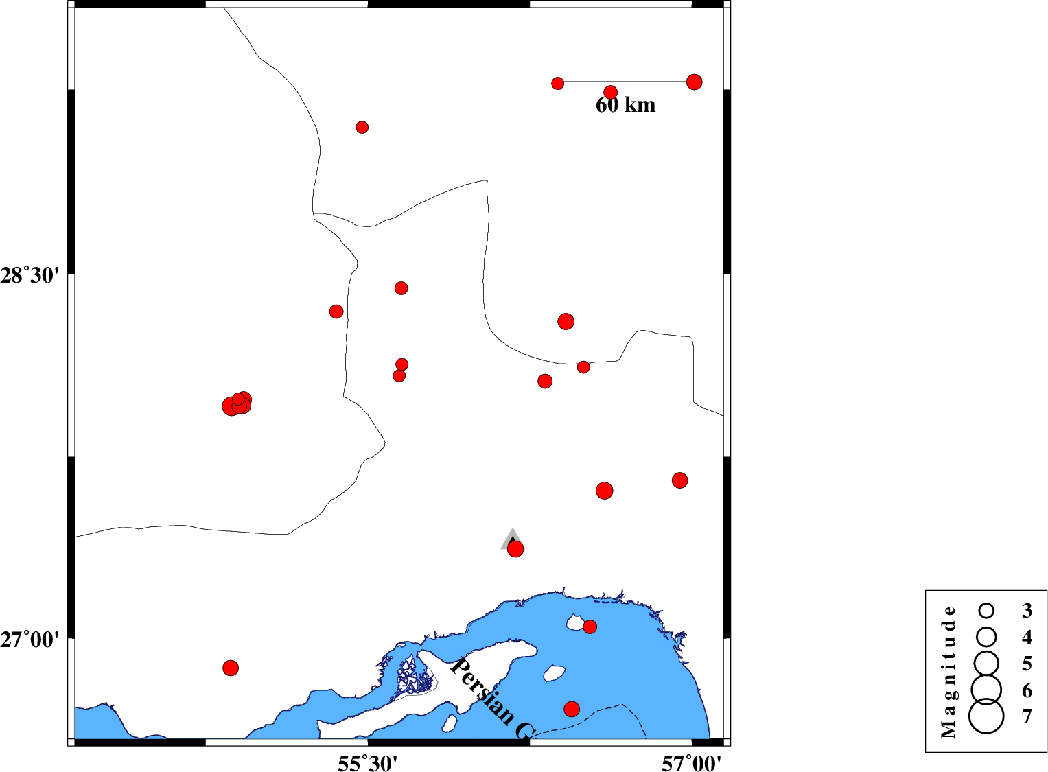 | 2017/04/18 | 01:20:04.7 | 05:50:04.7 | 27.047 | 56.528 | 11 | ML2.8 | Persian Gulf, 28 km -East of Qeshm | ||