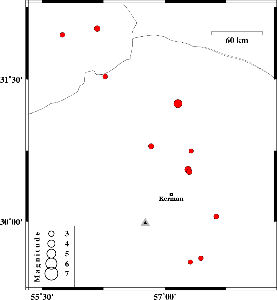 2017/05/17 | 18:04:22.0 | 22:34:22.0 | 30.052 | 57.627 | 18 | ML:2.8 | Kerman Province, 59 km South-East of Kerman | ||