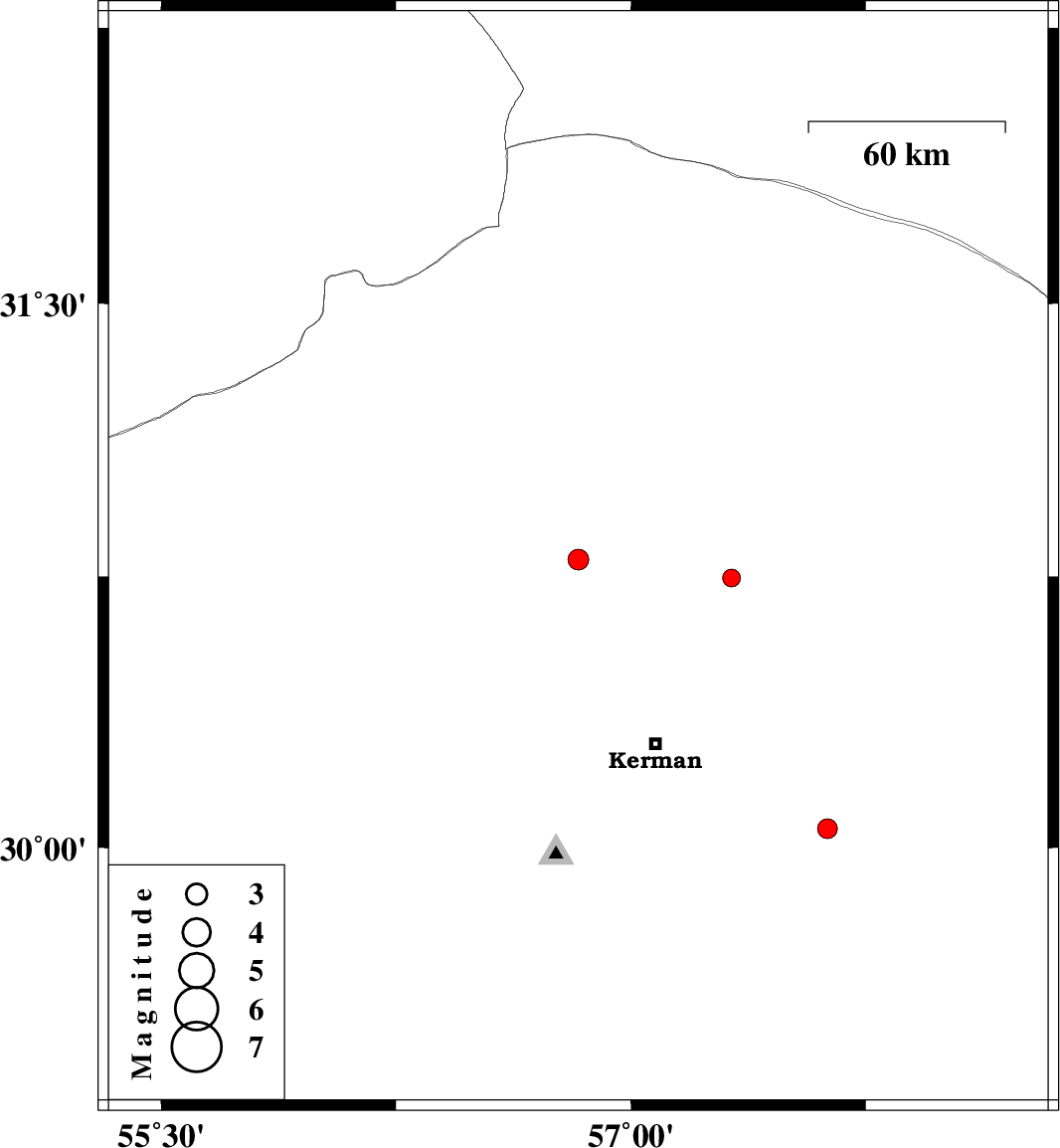 2017/05/17 | 18:04:22.0 | 22:34:22.0 | 30.052 | 57.627 | 18 | ML:2.8 | Kerman Province, 59 km South-East of Kerman | ||