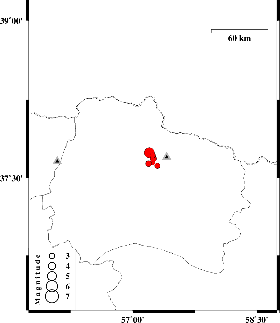 | 2017/05/13 | 22:16:18.9 | 02:46:18.9 | 37.649 | 57.239 | 14 | ML2.8 | Khorasan(north) Province, 21 km North of Bojnurd | ||