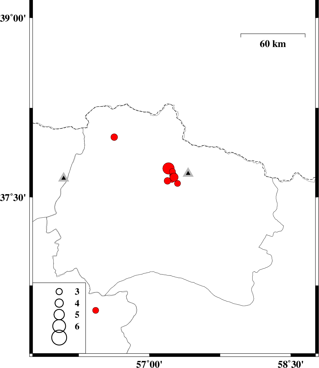 | 2017/05/14 | 07:26:38.3 | 11:56:38.3 | 37.617 | 57.298 | 17 | ML2.9 | Khorasan(north) Province, 16 km North of Bojnurd | ||