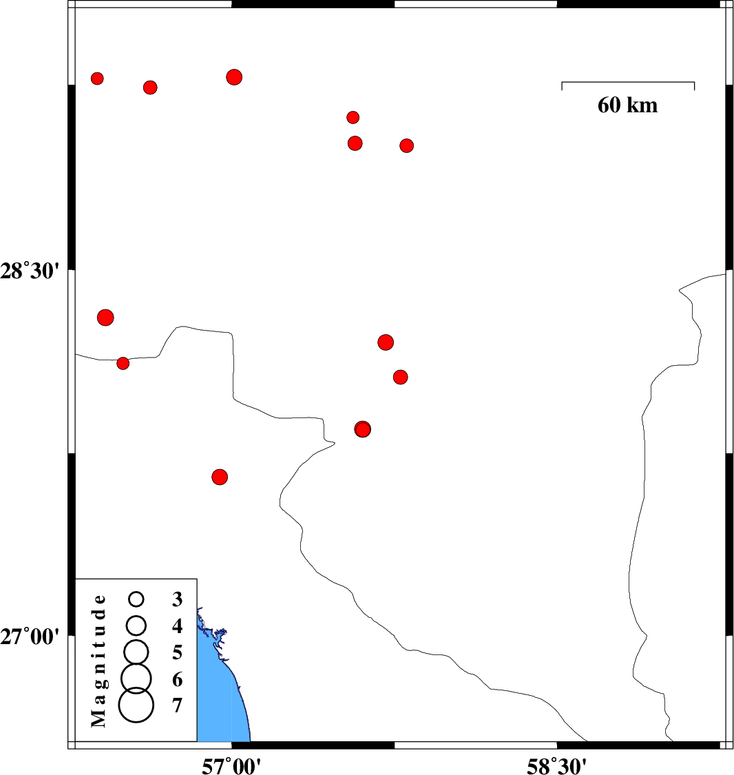 | 2017/05/19 | 05:29:10.7 | 09:59:10.7 | 27.846 | 57.604 | 14 | ML2.9 | Kerman Province, 15 km South of Kahnuj | ||