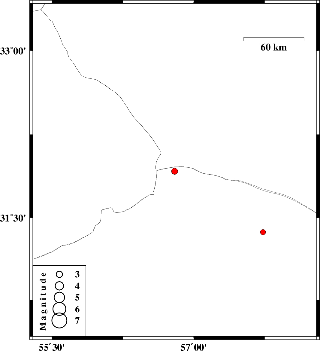 | 2017/05/28 | 20:03:49.8 | 00:33:49.8 | 31.369 | 57.733 | 15 | ML2.5 | Kerman Province, 88 km North-East of Ravar |