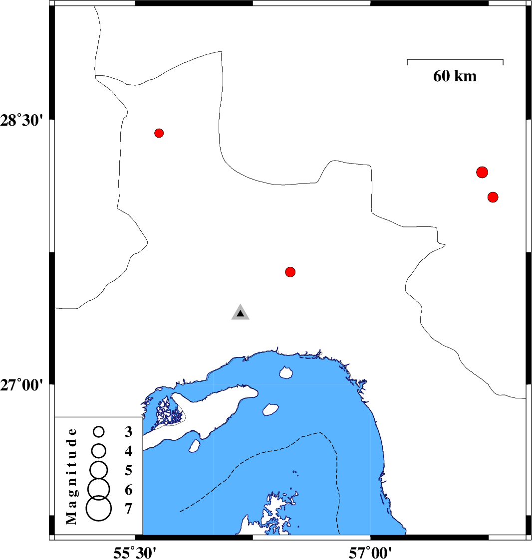 | 2017/06/02 | 18:57:21.5 | 23:27:21.5 | 27.638 | 56.488 | 14 | ML2.8 | Hormozgan Province, 54 km North-East of Bandar-e abbas | ||