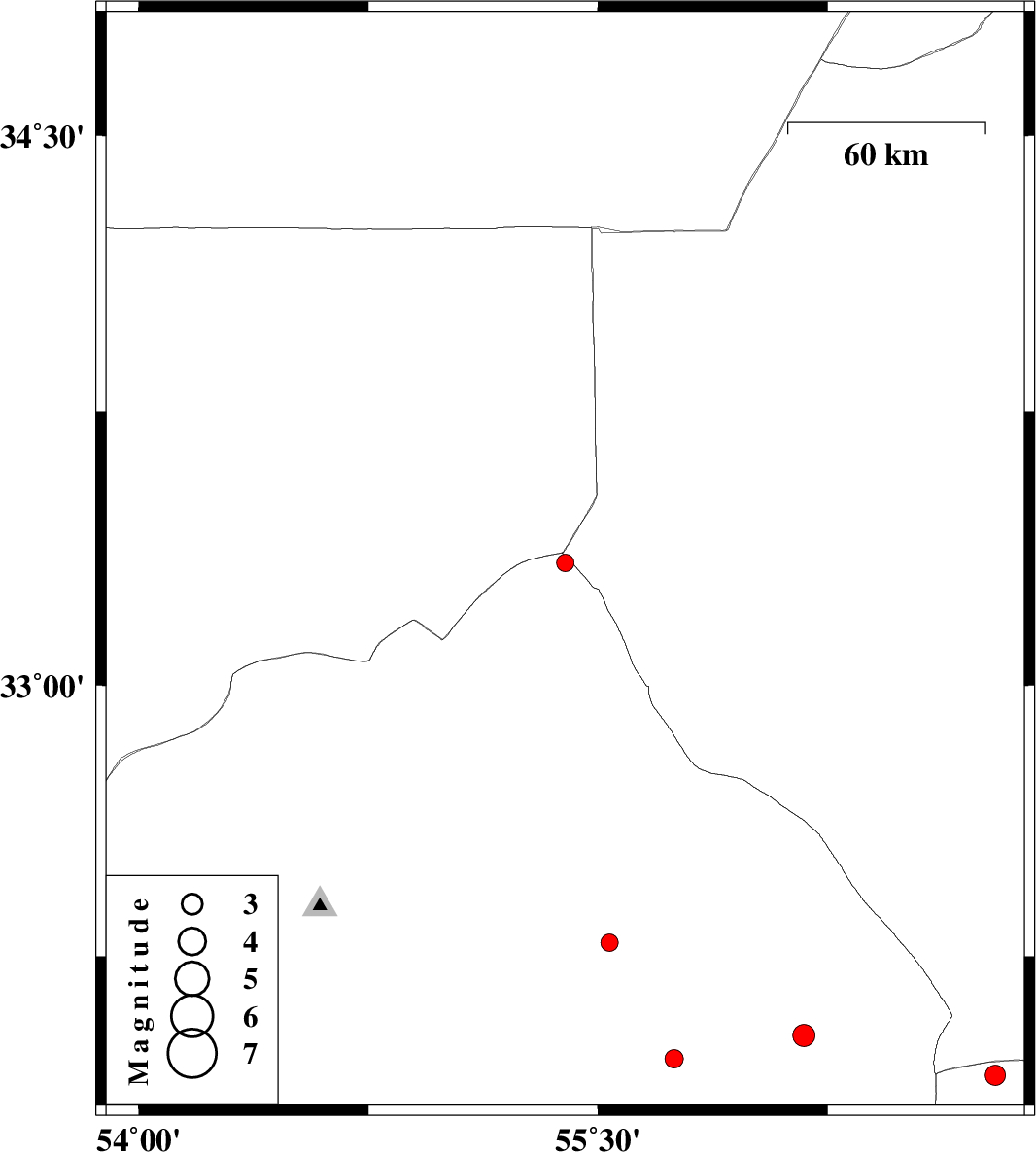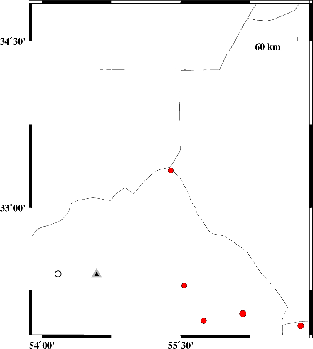 | 2017/05/20 | 16:29:42.4 | 20:59:42.4 | 32.287 | 55.537 | 9 | ML2.5 | Yazd Province, 77 km North-East of Bafq | ||