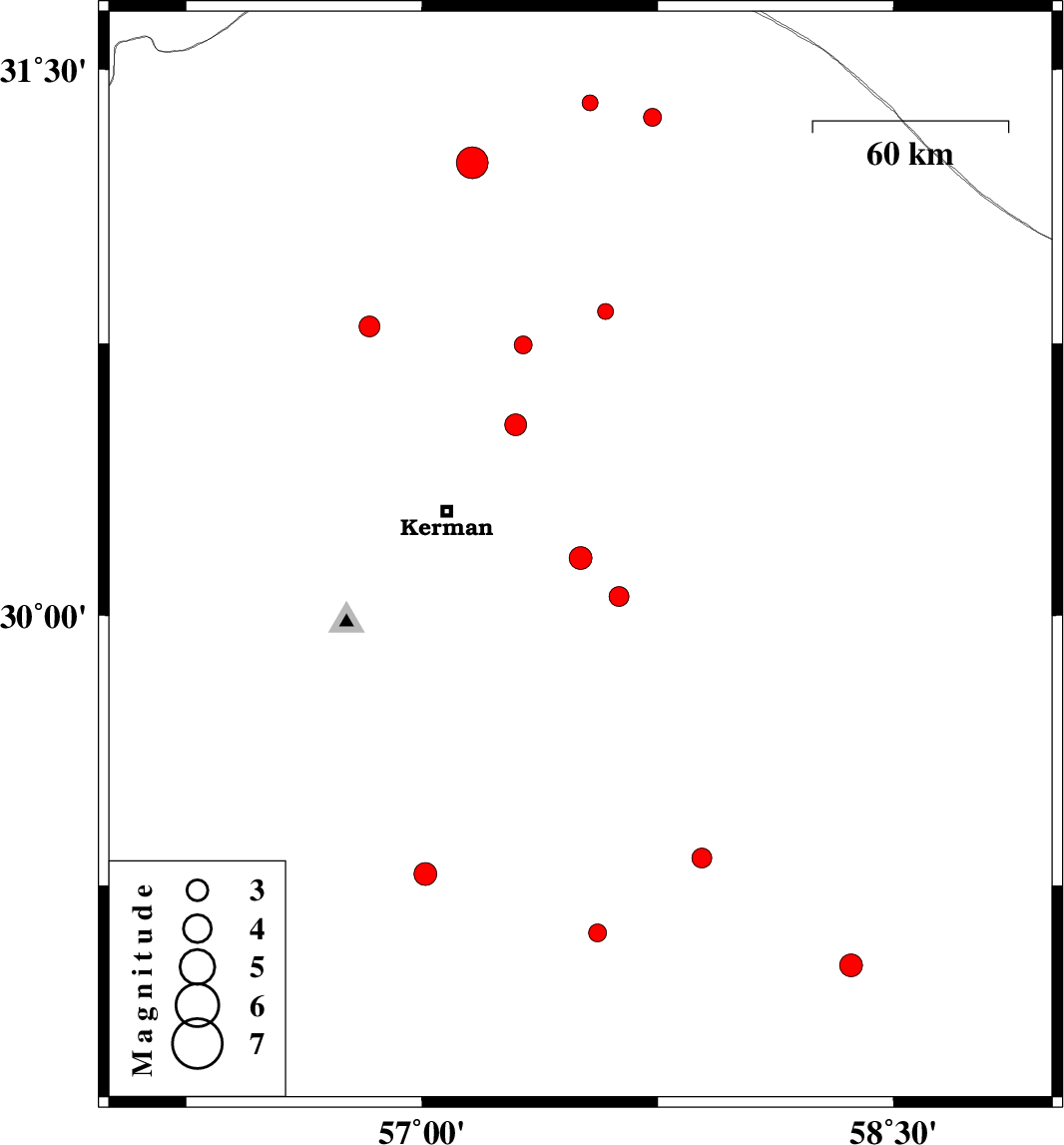 2017/05/17 | 18:04:22.0 | 22:34:22.0 | 30.052 | 57.627 | 18 | ML:2.8 | Kerman Province, 59 km South-East of Kerman | ||