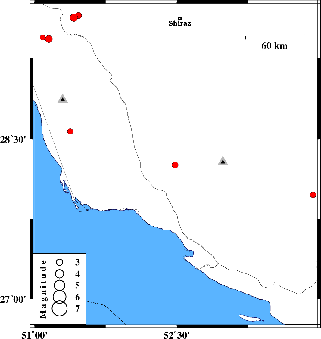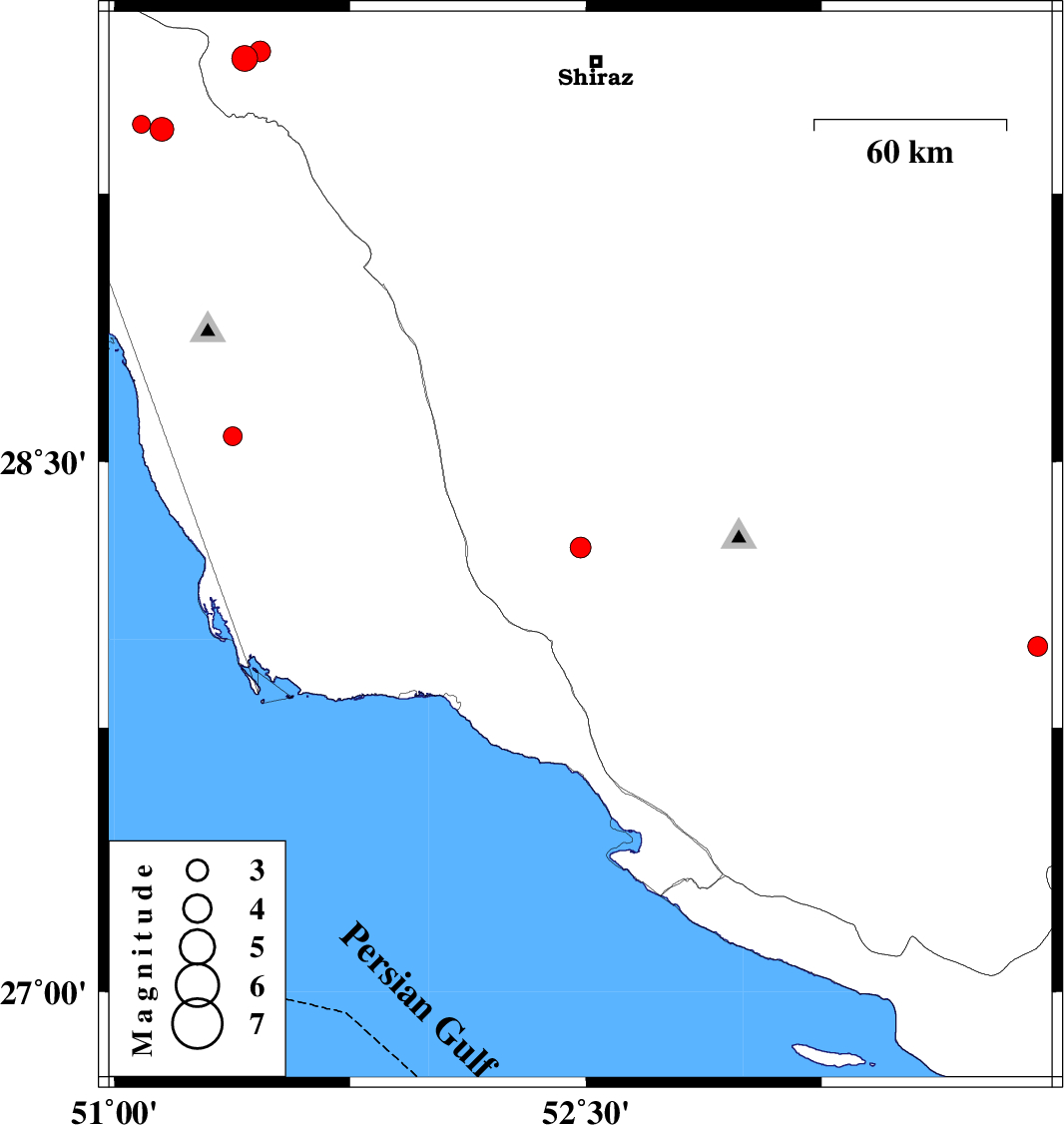 | 2017/06/04 | 22:24:21.3 | 02:54:21.3 | 29.443 | 51.086 | 14 | ML2.5 | Bushehr Province, 23 km North-West of Borazjan | ||