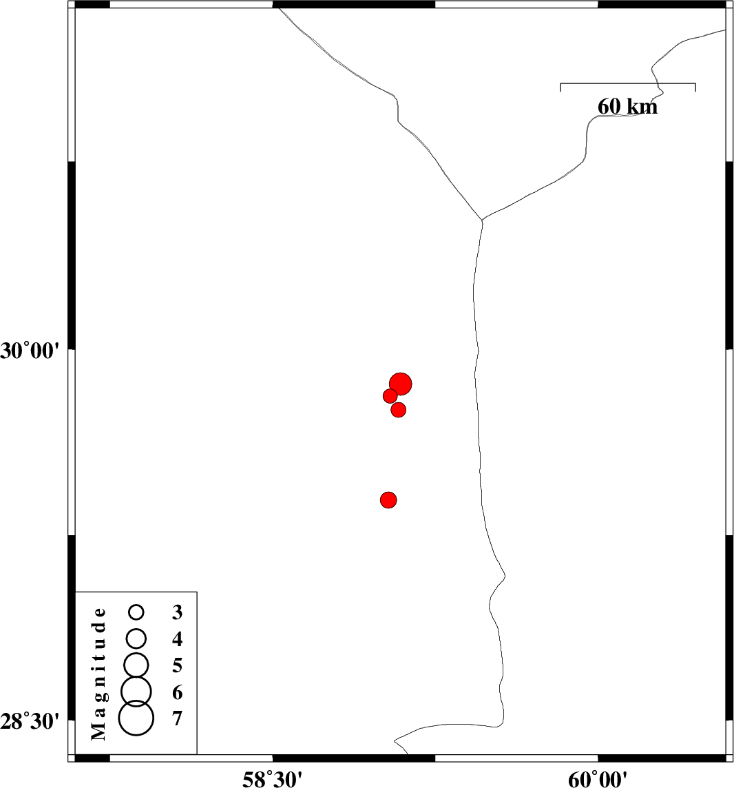 | 2017/06/10 | 04:07:03.4 | 08:37:03.4 | 29.86 | 59.089 | 14 | ML4.7 | Kerman Province, 110 km North-East of Bam | ||