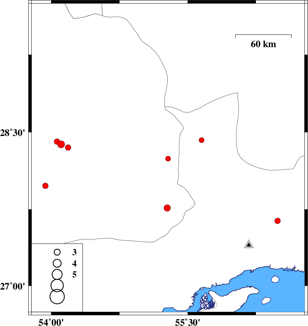 2017/06/02 | 12:11:57.8 | 16:41:57.8 | 28.382 | 54.11 | 7 | ML3.5 | Fars Province, 55 km South-East of Jahrom | ||