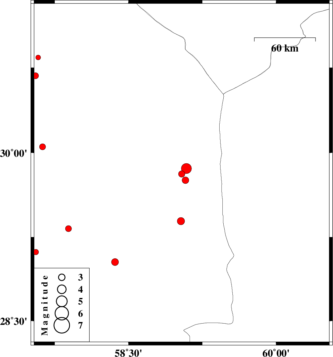 2017/06/10 | 04:07:03.4 | 08:37:03.4 | 29.86 | 59.089 | 14 | ML:4.7 | Kerman Province, 110 km North-East of Bam | ||