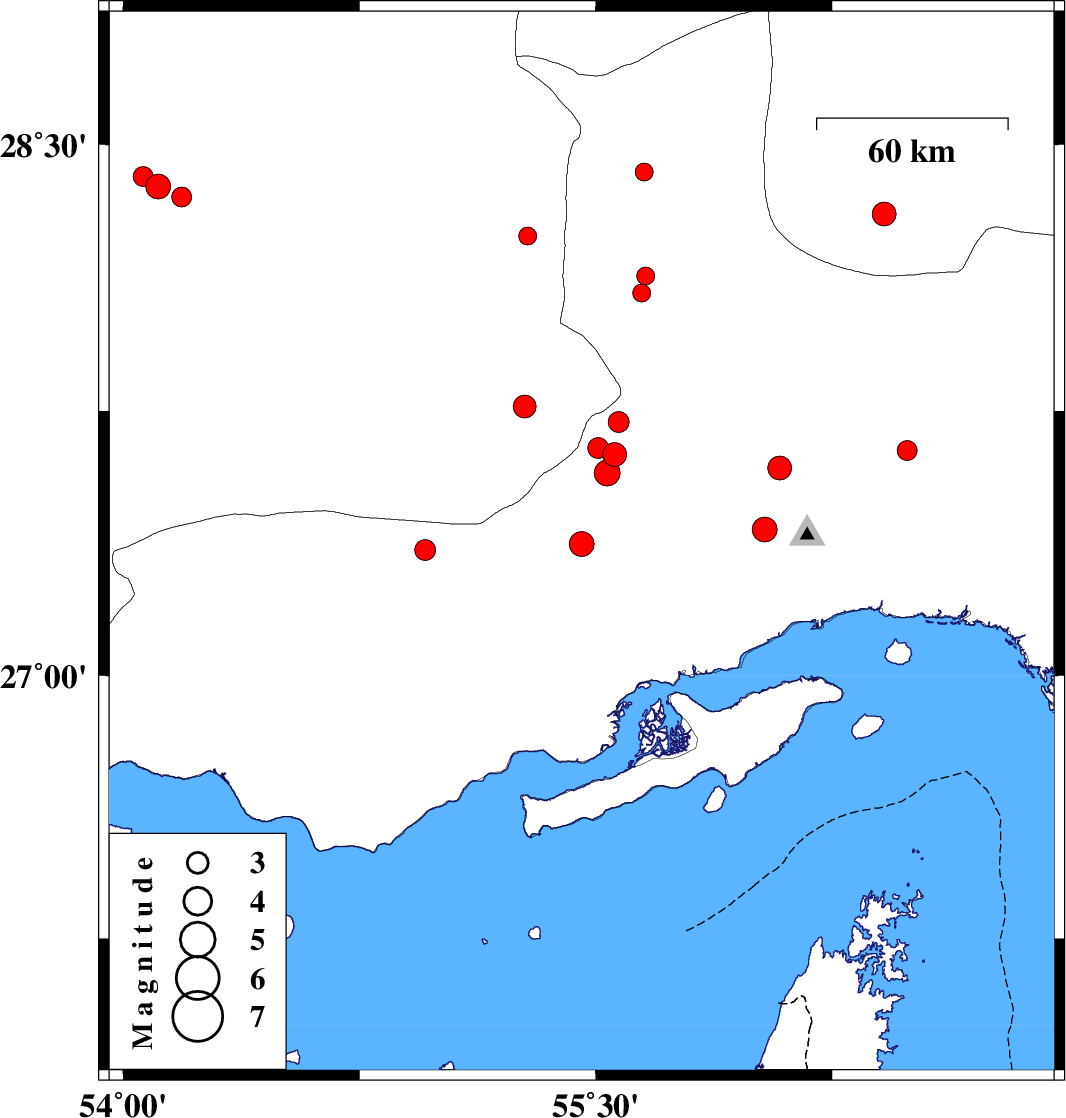 | 2017/06/02 | 12:11:57.8 | 16:41:57.8 | 28.382 | 54.11 | 7 | ML3.5 | Fars Province, 55 km South-East of Jahrom | ||