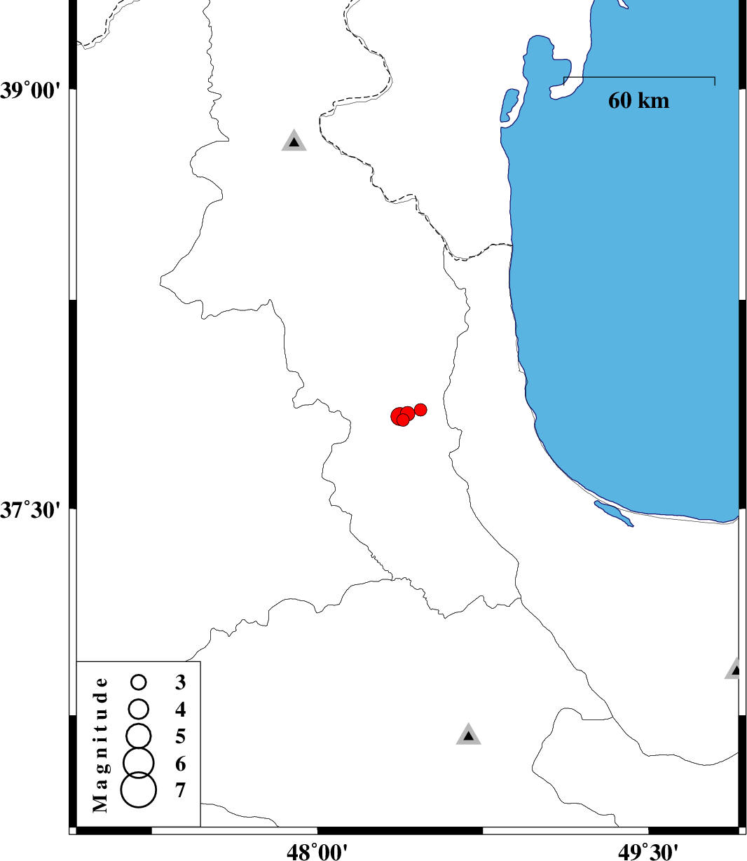 2017/06/11 | 08:07:13.3 | 12:37:13.3 | 37.832 | 48.373 | 15 | ML3.7 | Ardebil Province, 15 km North of Givi |