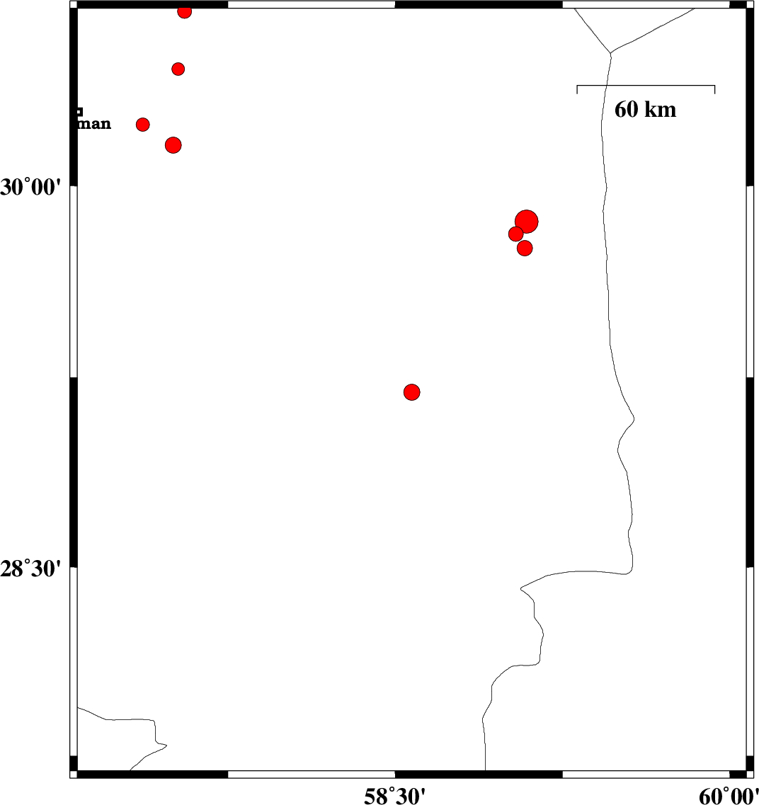 2017/06/10 | 04:07:03.4 | 08:37:03.4 | 29.86 | 59.089 | 14 | ML4.7 | Kerman Province, 110 km North-East of Bam | ||