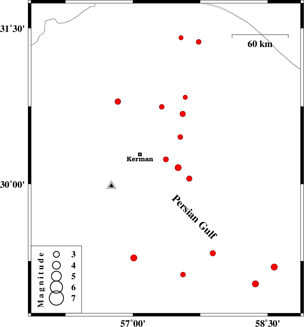 2017/06/12 | 12:45:11.7 | 17:15:11.7 | 29.191 | 58.574 | 14 | ML:3.3 | Kerman Province, 23 km -East of Bam | ||