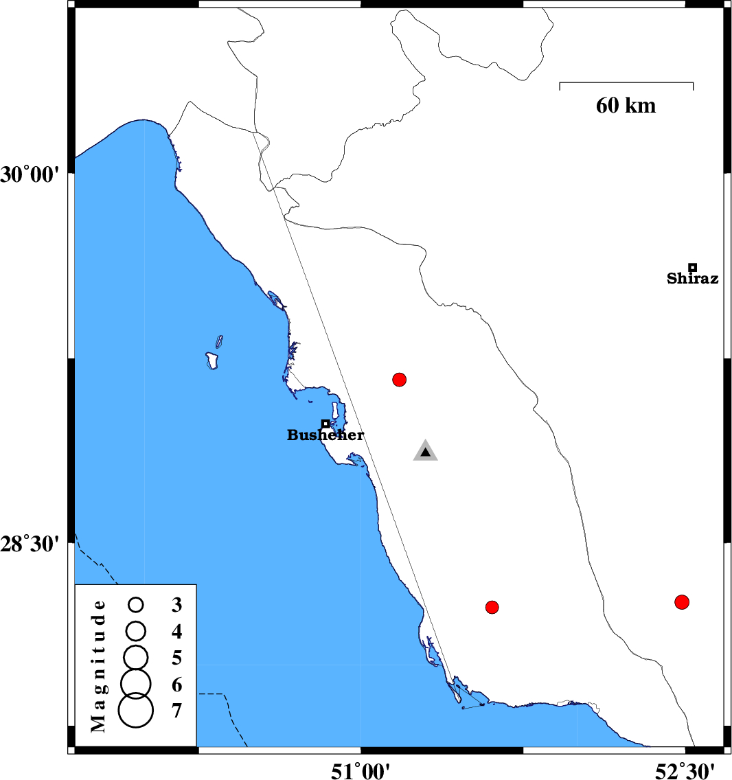 | 2017/06/14 | 06:00:27.6 | 10:30:27.6 | 29.164 | 51.177 | 14 | ML2.8 | Bushehr Province, 11 km of Borazjan | ||