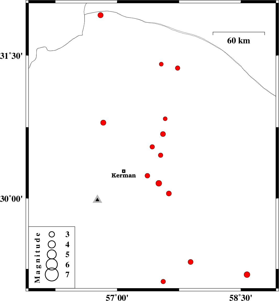 | 2017/06/09 | 15:05:58.7 | 19:35:58.7 | 30.678 | 57.555 | 14 | ML2.8 | Kerman Province, 63 km North-East of Kerman | ||