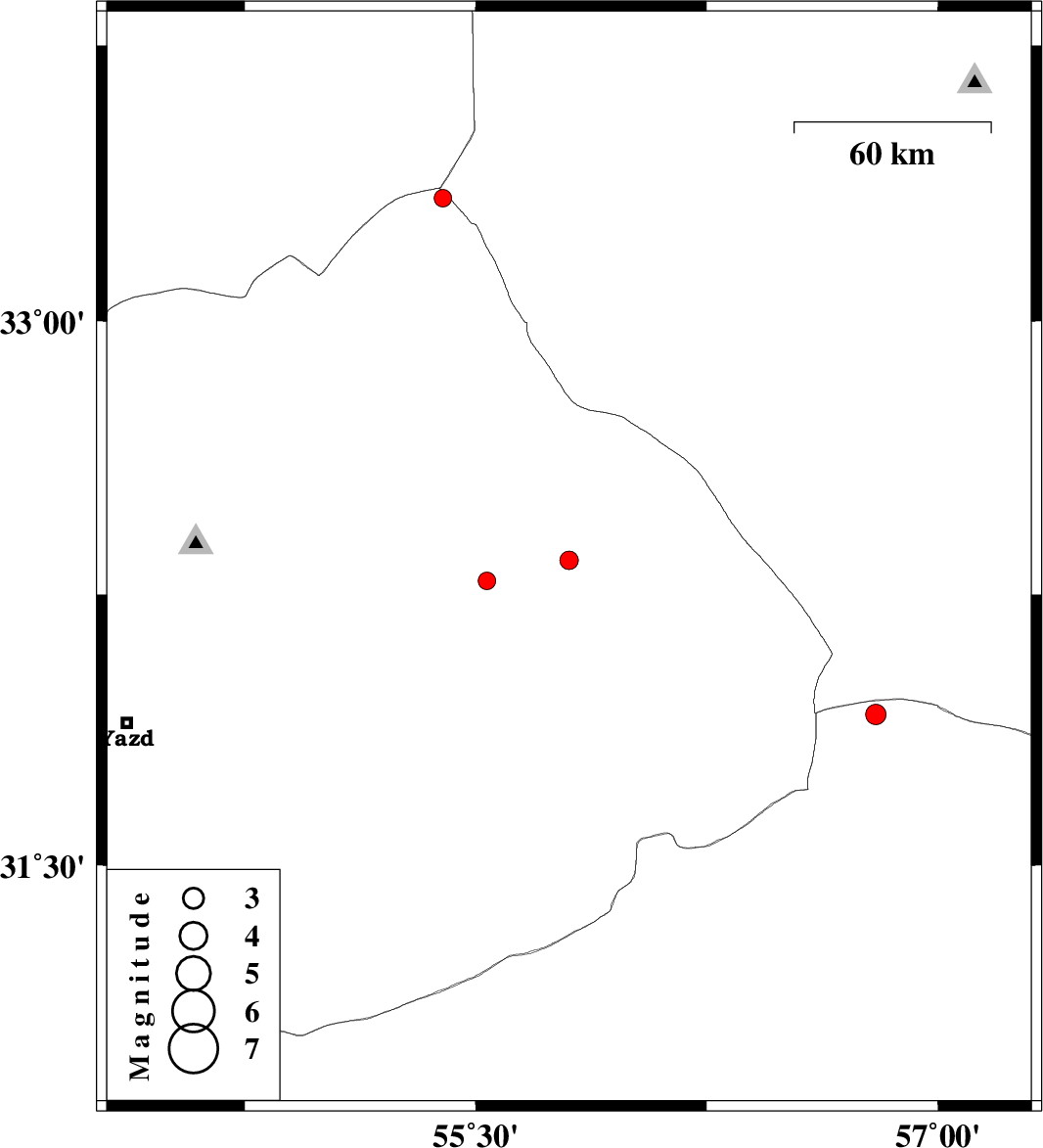 | 2017/05/20 | 16:29:42.4 | 20:59:42.4 | 32.287 | 55.537 | 9 | ML2.5 | Yazd Province, 77 km North-East of Bafq |