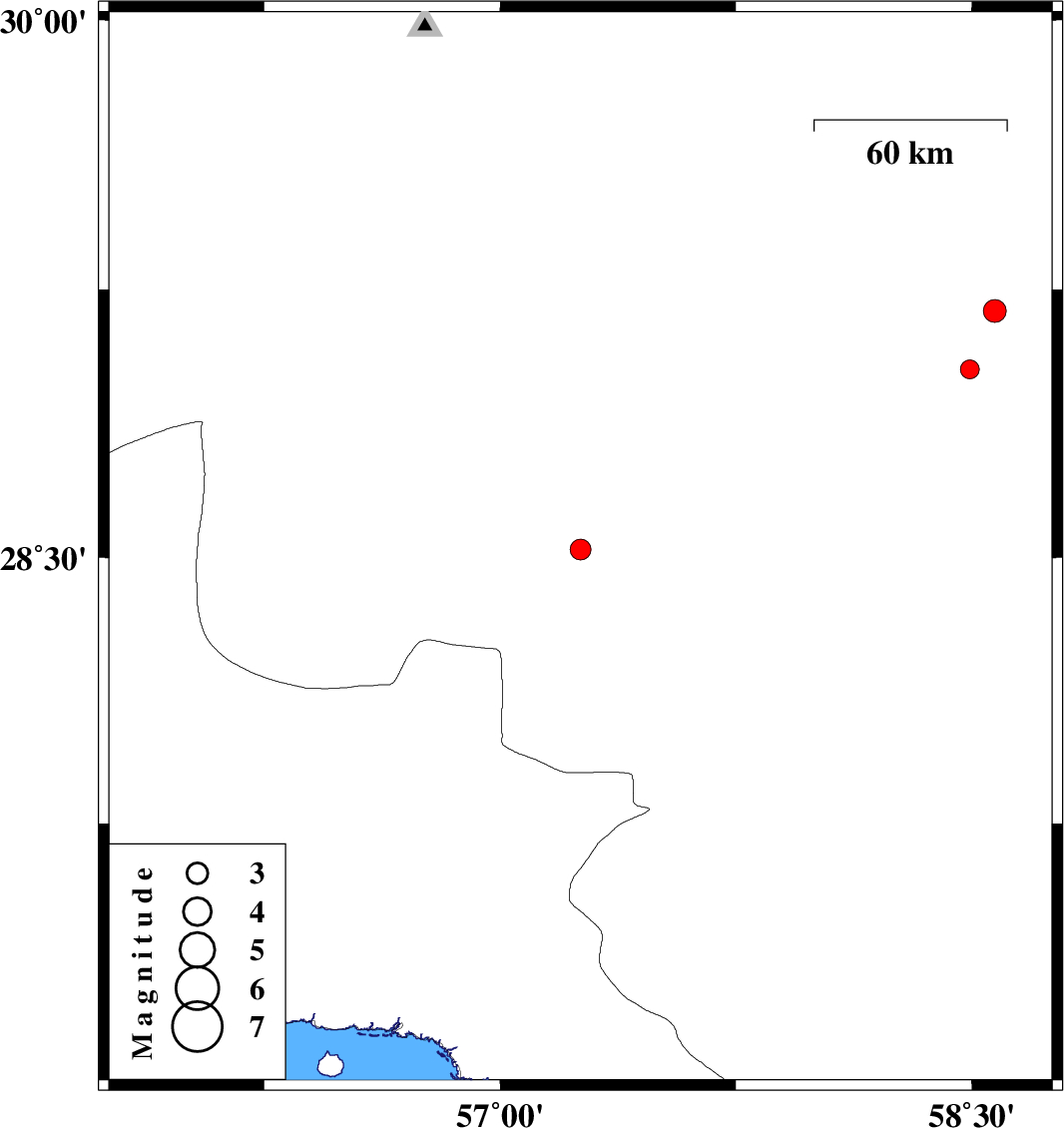 | 2017/06/15 | 01:54:41.1 | 06:24:41.1 | 29.027 | 58.495 | 14 | ML2.7 | Kerman Province, 16 km -East of Bam | ||