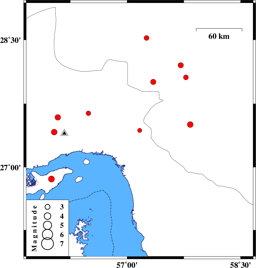 | 2017/06/17 | 09:07:54.2 | 13:37:54.2 | 28.007 | 57.345 | 15 | ML3.2 | Kerman Province, 35 km -West of Kahnuj | ||