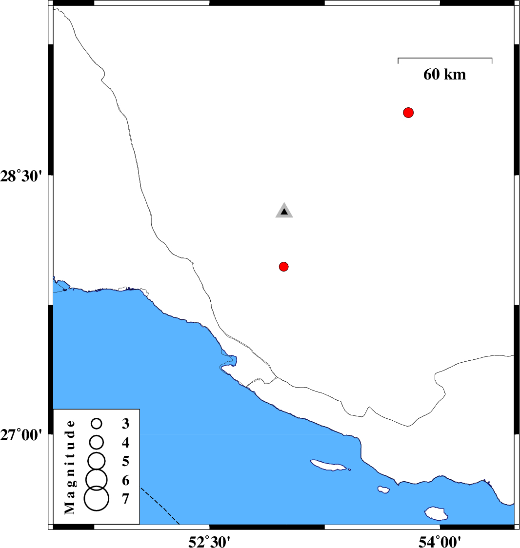 | 2017/06/25 | 02:30:07.2 | 07:00:07.2 | 27.972 | 52.983 | 14 | ML2.7 | Fars Province, 48 km North of Mehr | ||