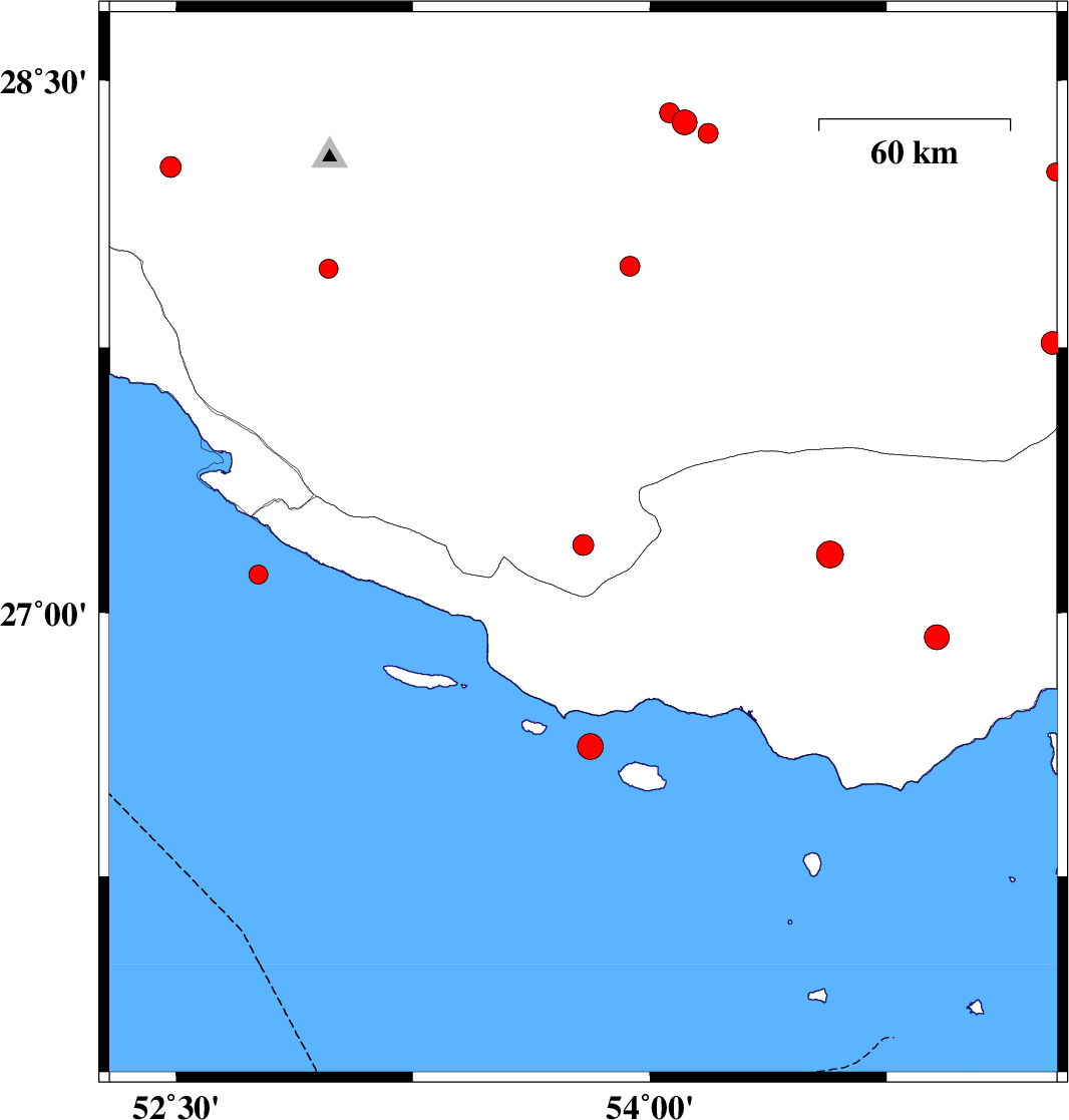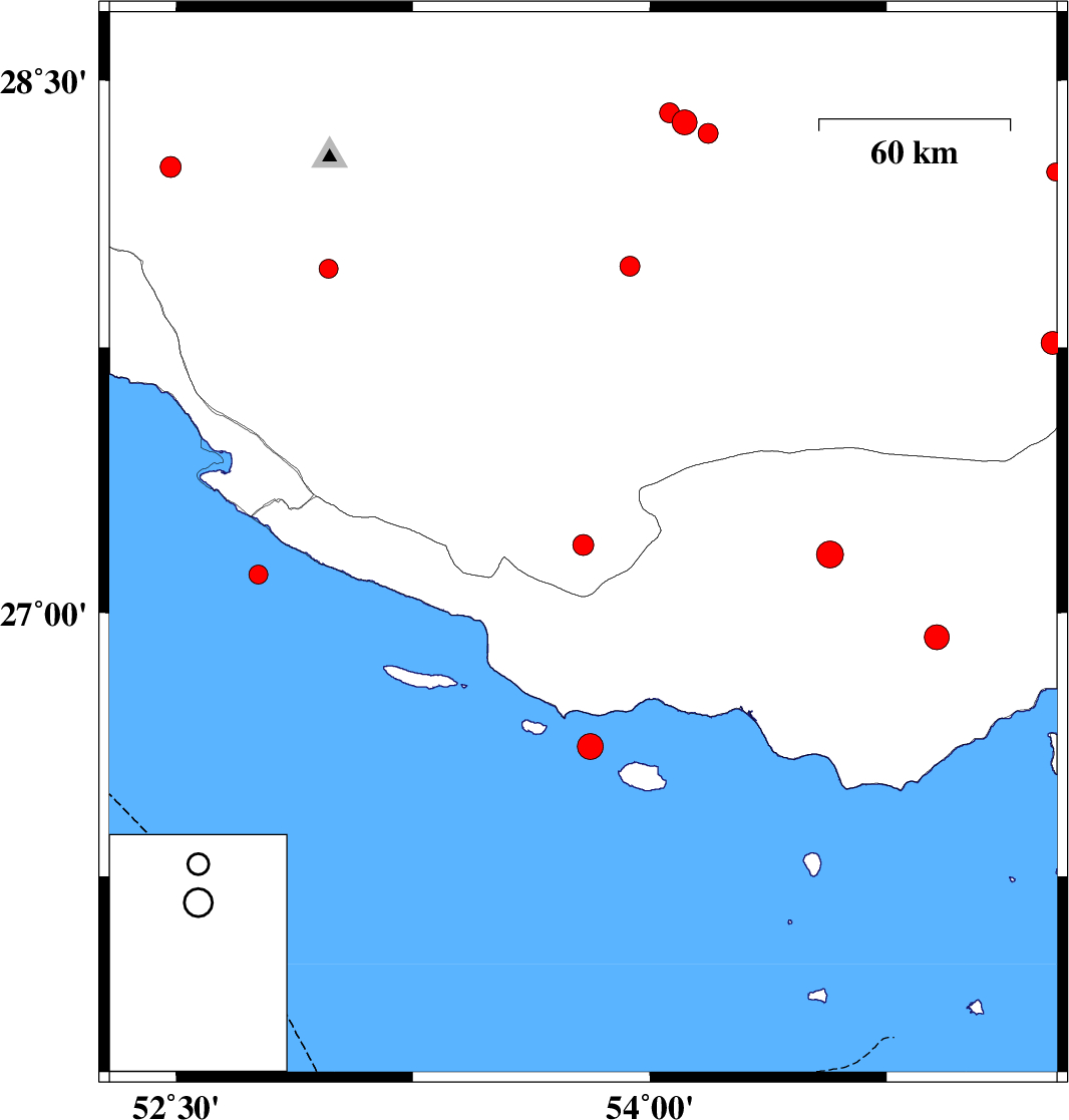 | 2017/06/25 | 02:30:07.2 | 07:00:07.2 | 27.972 | 52.983 | 14 | ML2.7 | Fars Province, 48 km North of Mehr | ||