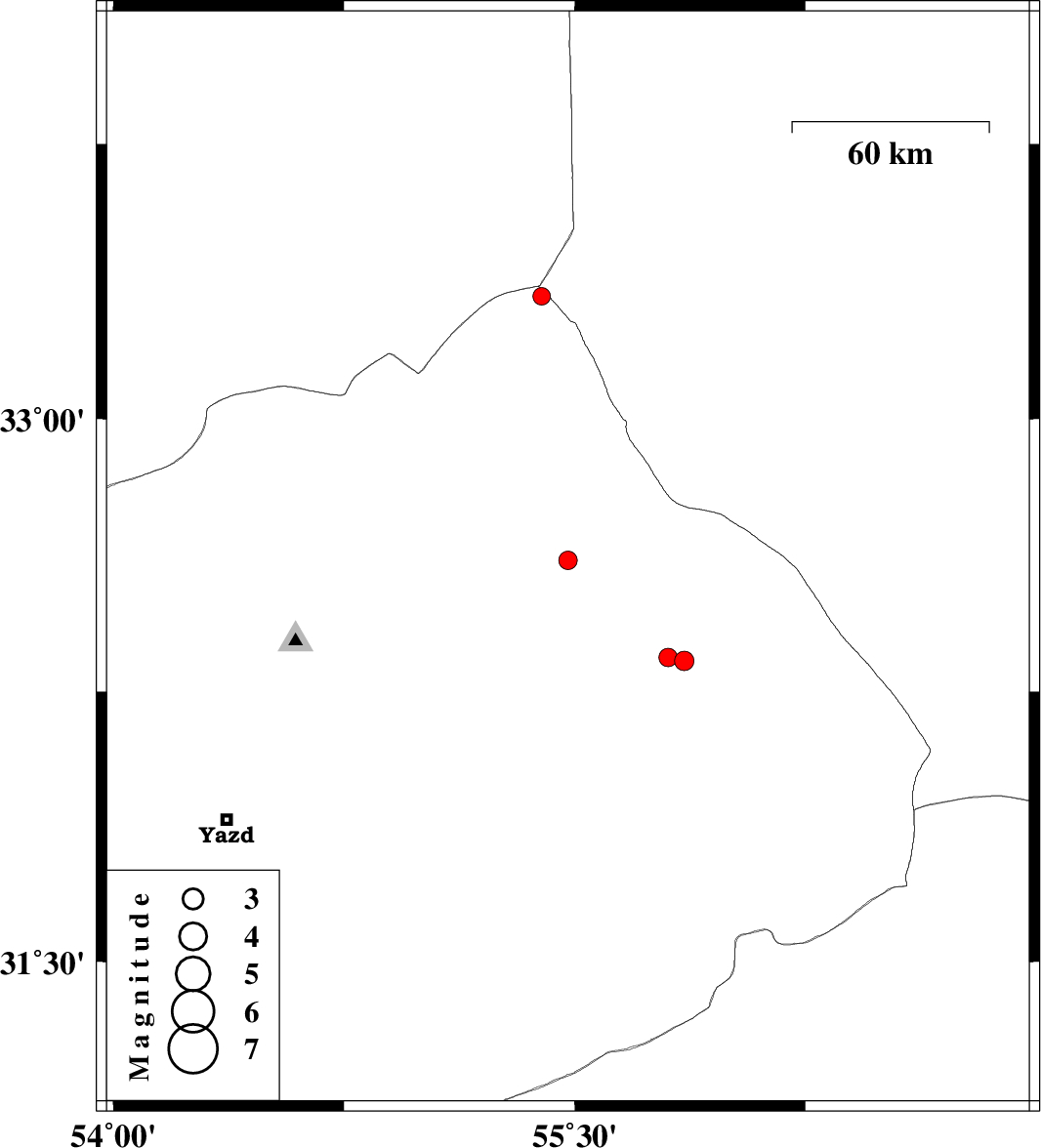 | 2017/06/30 | 21:51:38.8 | 02:21:38.8 | 32.612 | 55.478 | 15 | ML2.7 | Yazd Province, 112 km North of Bafq | ||