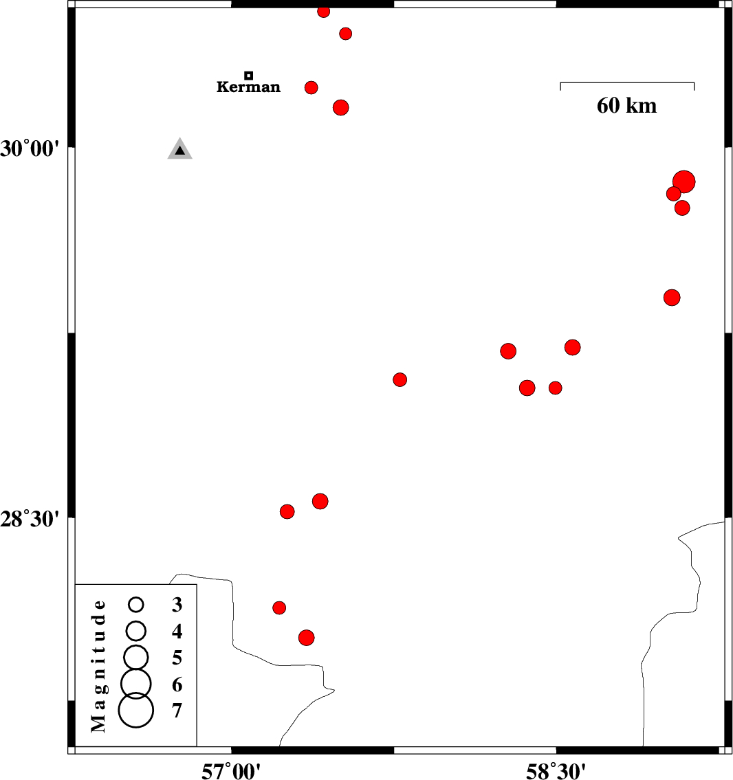 | 2017/06/26 | 01:35:10.3 | 06:05:10.3 | 28.565 | 57.409 | 17 | ML3.2 | Kerman Province, 34 km South-West of Jiroft | ||